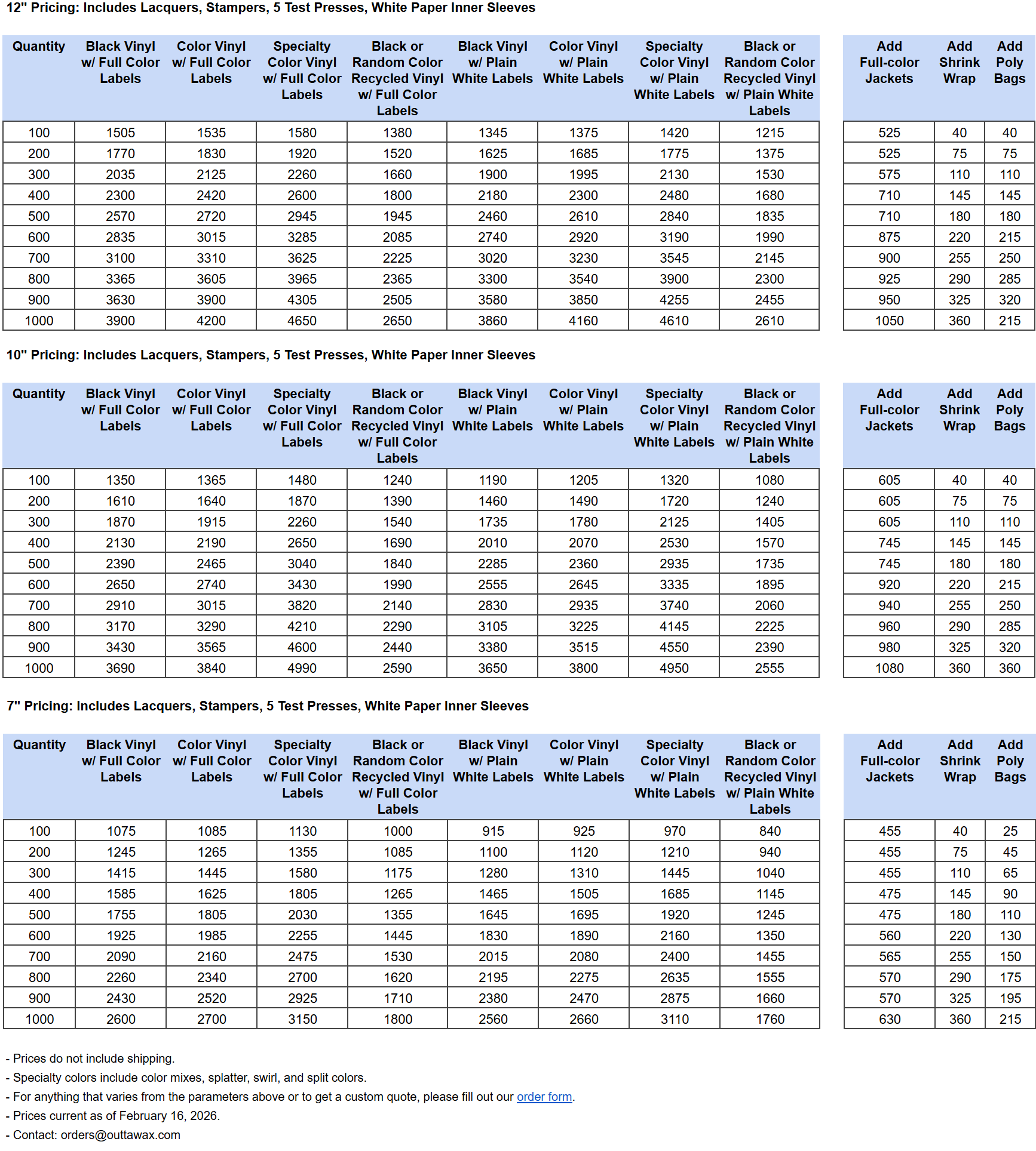 These are our most up-to-date pricing grids for 12”, 10”, and 7” records. Unlike most other pressing plants, we do all of these in house! To get started or for a custom quote, please fill out our order form. Let’s do this!